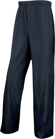 Spodnie przeciwdeszczowe. Szwy zgrzewane. Gumka w talii. Rozporek zapinany na zatrzaski. Dół nogawek regulowany na zatrzaski. 2 kieszenie na ręce. Wkład: poliester powlekany PU na zewnątrz.